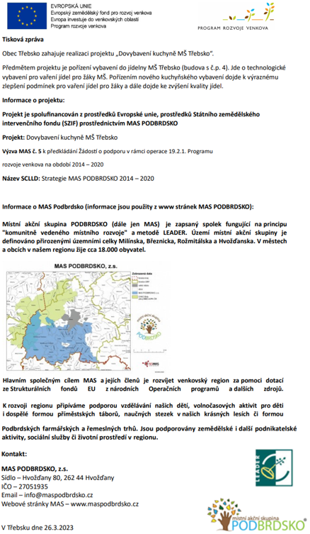 Tisková zpráva k zahájení realizace projektu "Dovybavení kuchyně MŠ Třebsko" 1